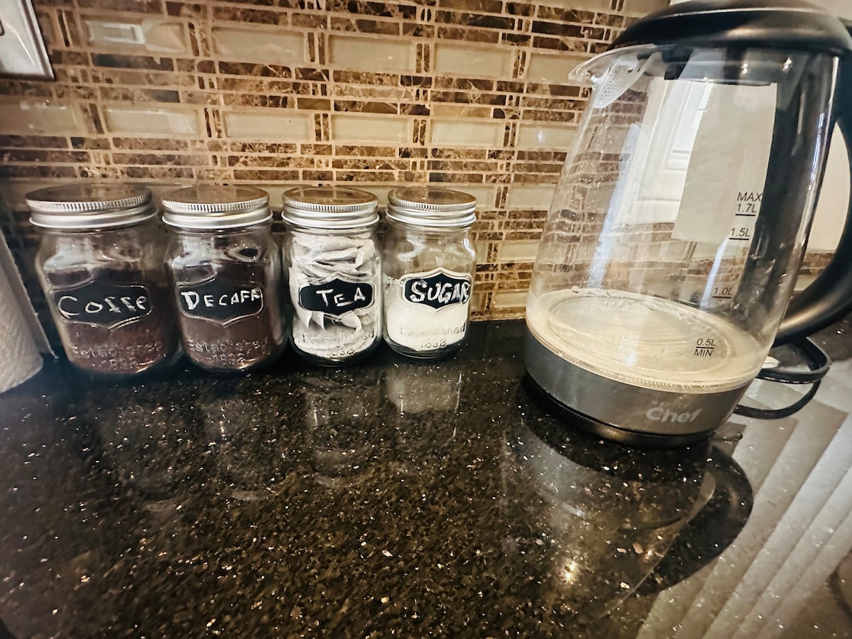 Spacious queen bedroom named Horizon View (with lock), featuring a sun light with huge windows This spacious room includes a queen bed along with a cozy seating chair and closet.